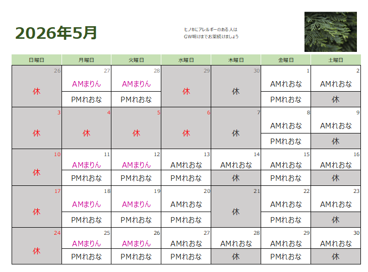 3月の診療予定カレンダー